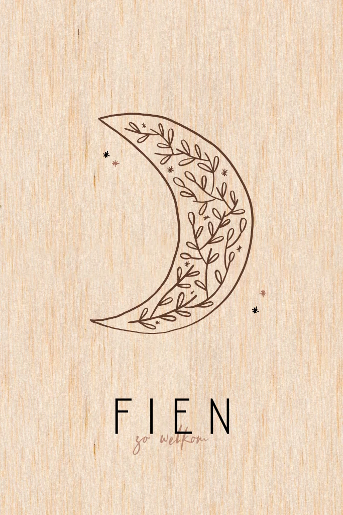 Een stoer geboortekaartje met een maantje met plantjes, gedrukt op echt hout. Kies zelf een andere kleur maan en sterretjes.