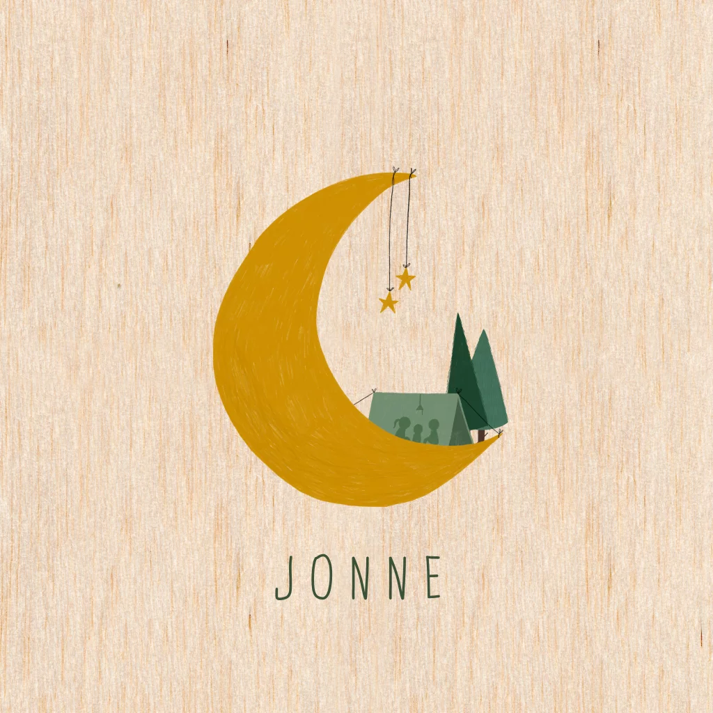 Een lief rustig geboortekaartje, gedrukt op echt hout, met een maan, sterretjes en een tentje met knusse silhouette. Liever een andere kleur tent? Stuur me even een berichtje. Leuk voor jongens en meisjes.