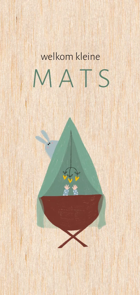 Een minimalistisch geboortekaartje gedrukt op echt hout, met een lief wiegje en een konijntje. Liever op een rechthoekig kaartje of vierkant kaartje? Mail me eventjes.