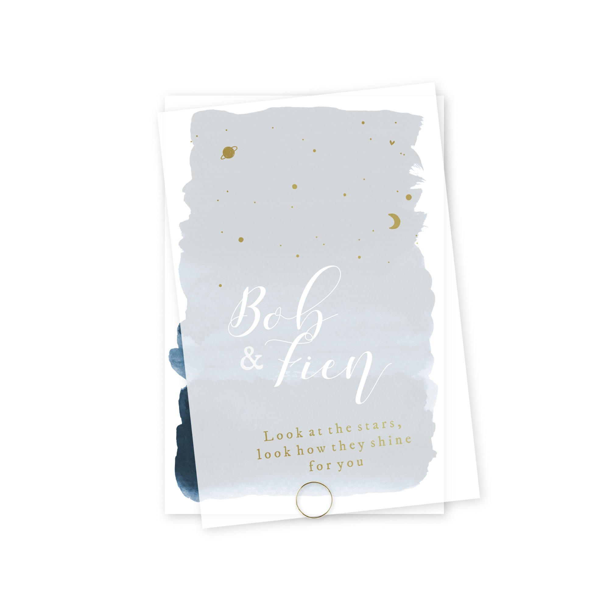 Trouwkaart kalkpapier voorzijde met goudfolie planeten en sterren