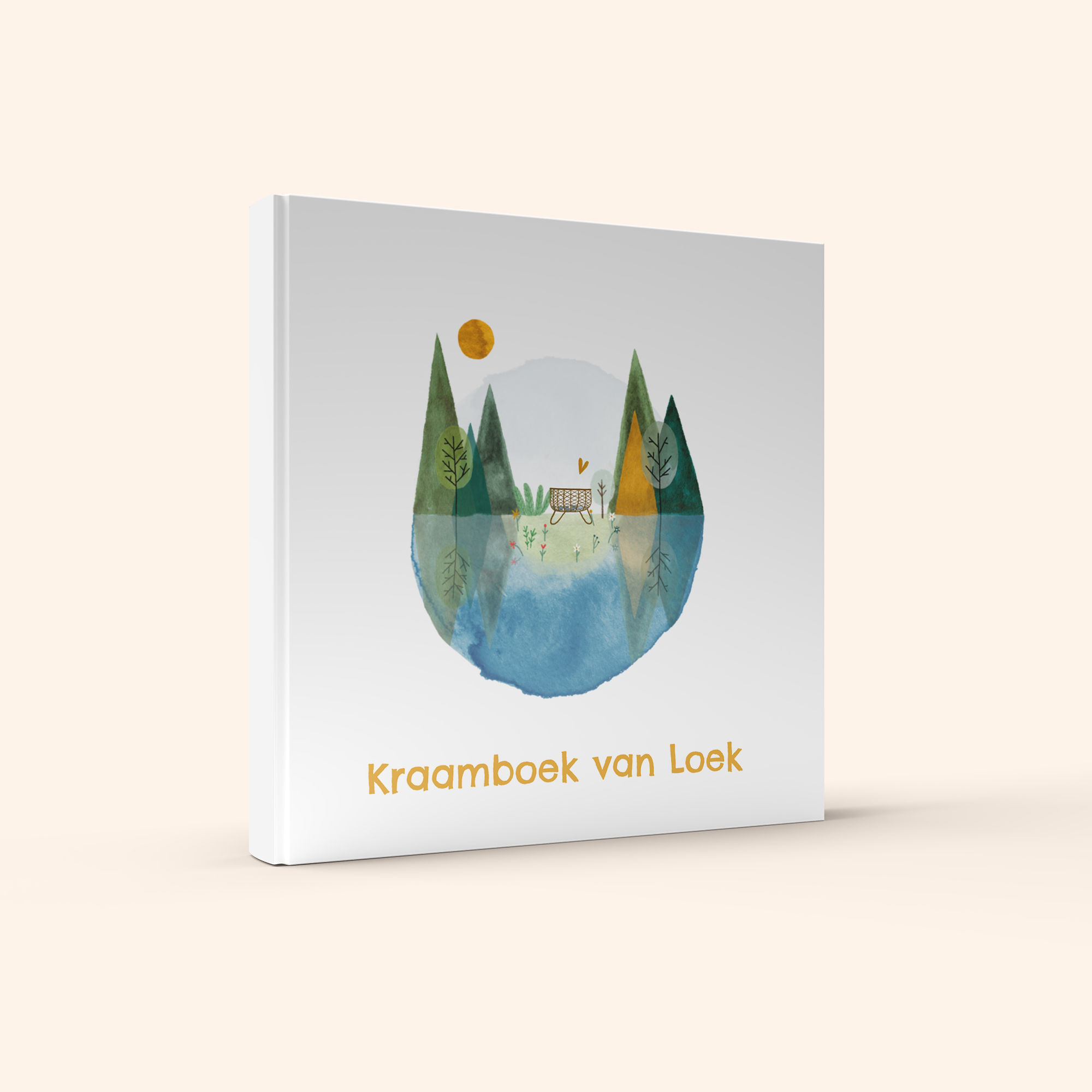 Een vrolijk en lief kraambezoekboek voor jouw kraambezoek. Het boek heeft een illustratie van een berglandschap en wiegje.