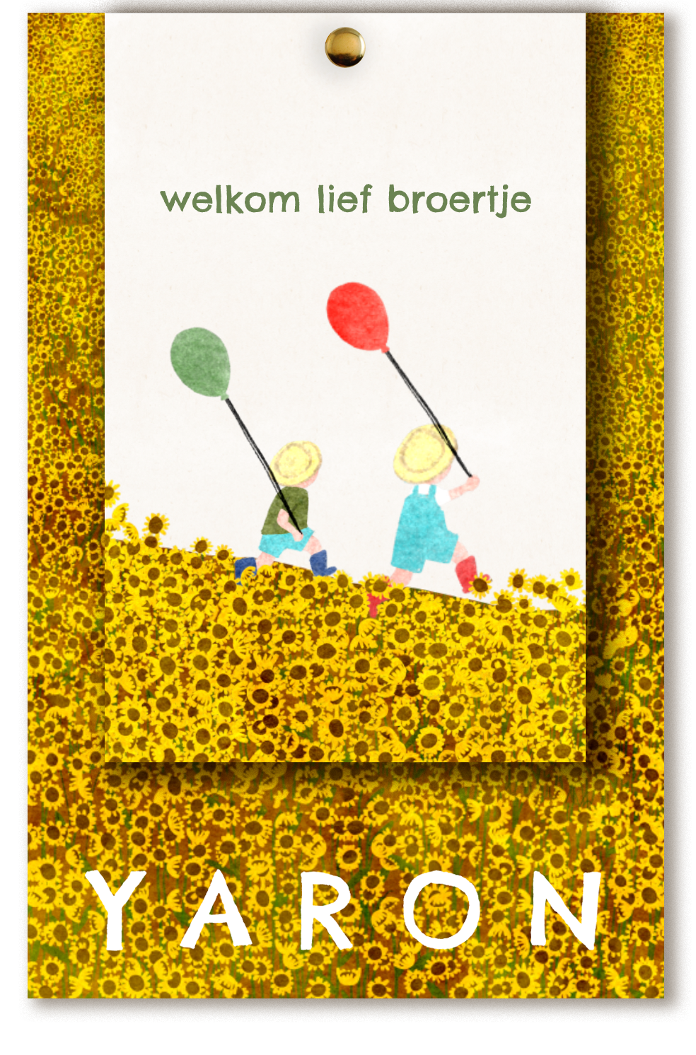 Een vrolijk en trendy geboortekaartje. Dit originele geboortekaartje bestaat uit twee labels. Op het voorste label zie je een illustratie van twee rennende jongetjes met ballonnen. Het achterste label heeft een illustratie van een veld vol zonnebloemen. Pas de kaartjes naar wens aan in de online editor.