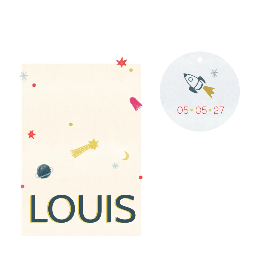 Een hip grafisch en speels geboortekaartje met een heelal in hele vrolijke stoere kleuren en een klein labeltje, wat je vast kunt maken met een splitpen of touwtje (let op, dit moet je los bestellen!). Het kaartje zelf is 10,5 cm x 15,5 cm.
