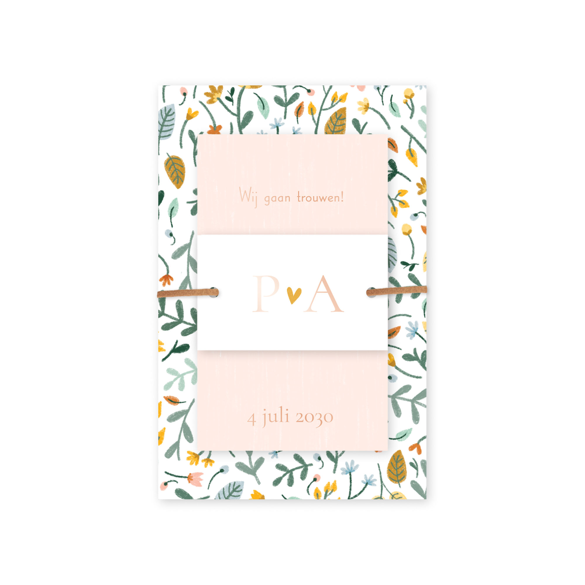 Een unieke trouwkaart set die bestaat uit drie kaarten die je aan elkaar vastmaakt met een touwtje. Hier kun je ook nog een leuk bloemetje tussen steken. Doordat je meerdere kaartjes hebt, heb je lekker veel ruimte om alle informatie en extra tekst/foto's op kwijt te kunnen. De maat van de grootste kaart is 11 x 17 cm. Let op: het touwtje wordt niet bij geleverd, deze kun je los bestellen bij de kaarten en vind je op de Extra’s pagina.