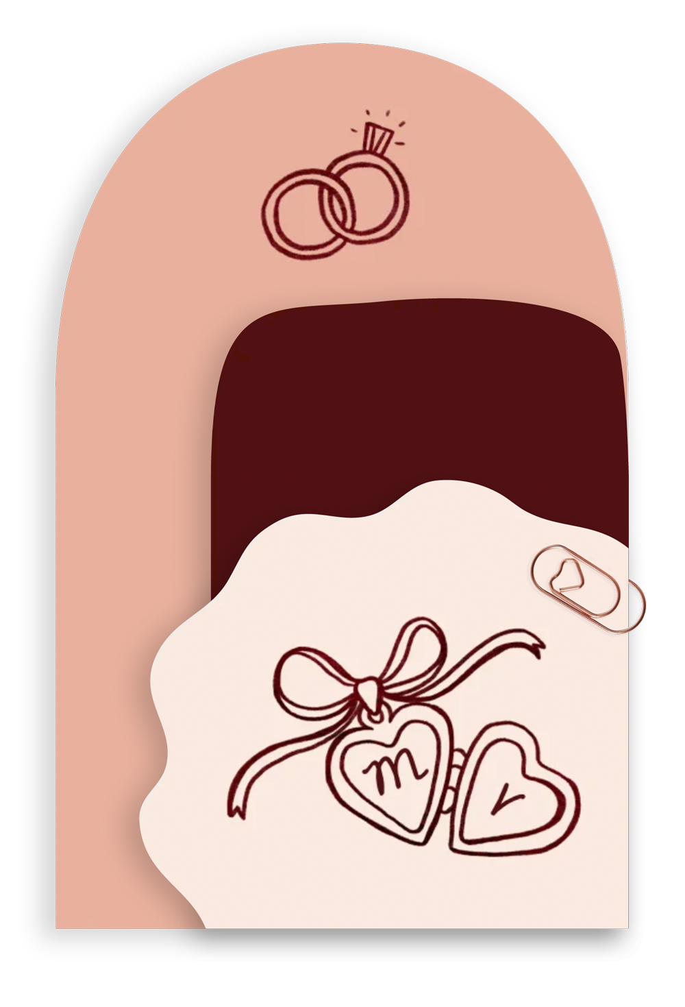 Een moderne trouwkaartenset met drie kaartjes in warme tinten van kersenrood, licht terracotta en bordeaux lijntekeningen. De unieke vormen en handgetekende rococo stijl illustraties geven de kaart een hippe en persoonlijke uitstraling. Bewerk deze stijlvolle trouwkaart eenvoudig in de online editor.