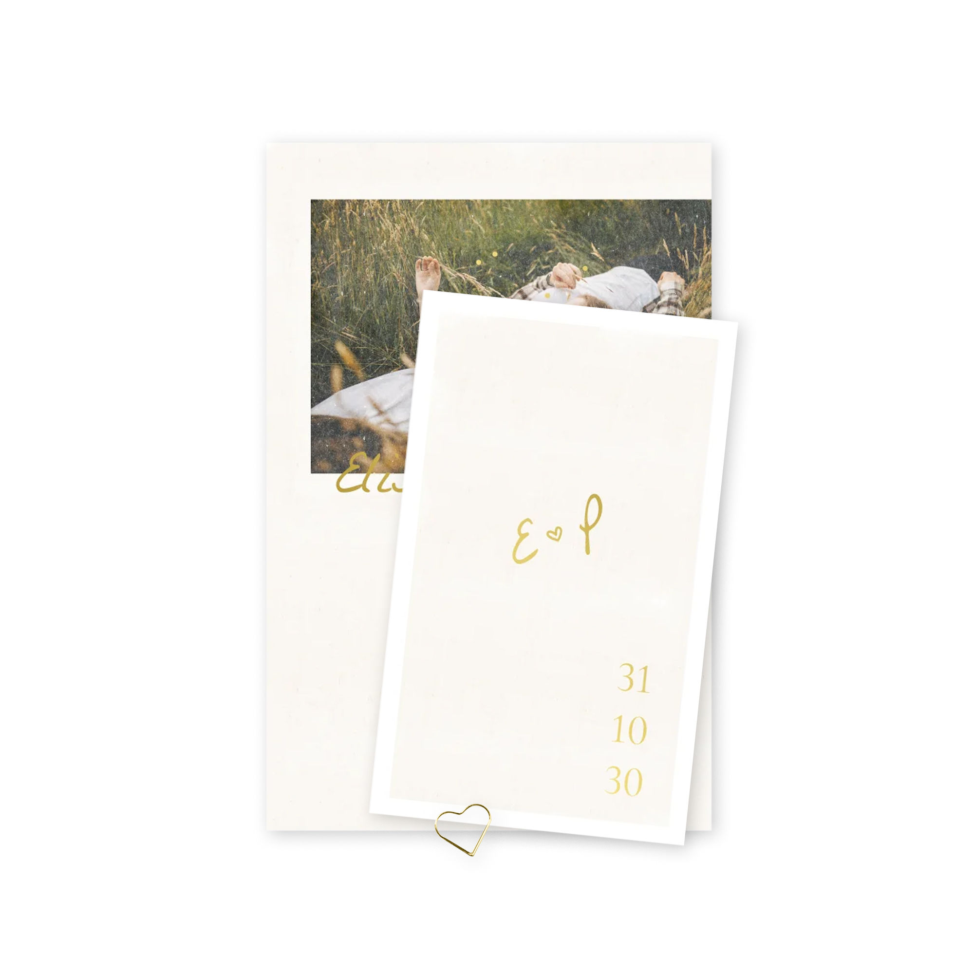 Een moderne trouwkaart met foto, minimalistische opmaak en poëtische details. De combinatie van natuurlijke kleuren, handgeschreven typografie en eenvoud sluit perfect aan bij de trouwkaartentrends. Deze kaart straalt liefde, rust en elegantie uit. De goudfolie maakt het af. De maat van de grootste kaart is 11 x 17 cm. Hulp nodig? Mail gerust!