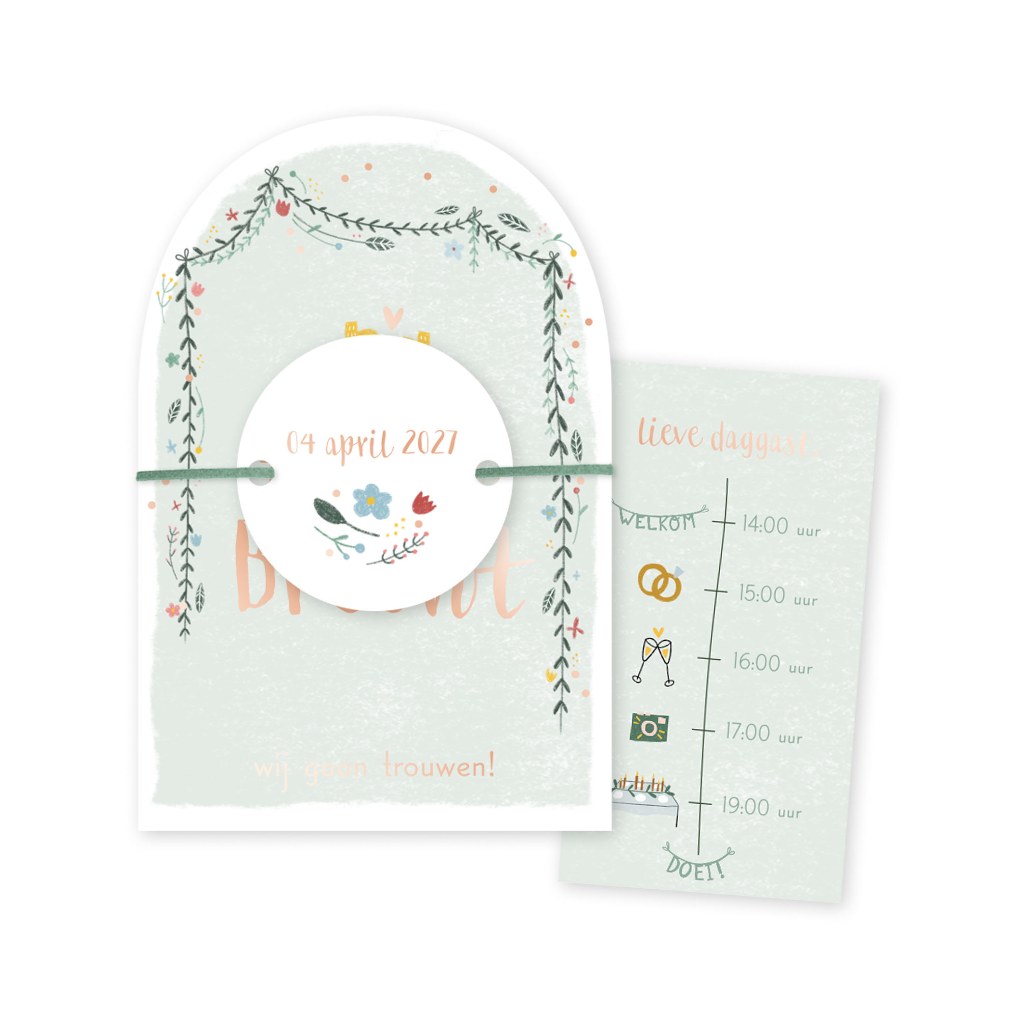 Een unieke trouwkaart set die bestaat uit meerdere kaartjes in verschillende vormen. De hoofdkaart heeft een hippe boogvorm en is geïllustreerd met een zomerse boog vol bloemetjes en blaadjes. Deze kaart heeft een formaat van 17x11 cm. Het kleinere kaartje kun je gebruiken als dagprogramma en op de achterkant kun je de praktische informatie kwijt. Maak het labeltje vast met een mooi lintje of touwtje. Let op: deze kun je los bestellen bij de kaarten en vind je op de Extra’s pagina.