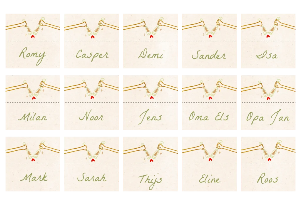 Gevouwen naamkaartjes voor jullie bruiloft in de stijl van de trouwkaart met vrolijke lijntekening. Je kunt hier 15 kaartjes bewerken en alle namen op het vel tegelijk invullen. Deze naamkaartjes zijn gevouwen en voorzien van een rillijn, zodat je ze kunt makkelijk neerzetten. Formaat: 8x4cm.