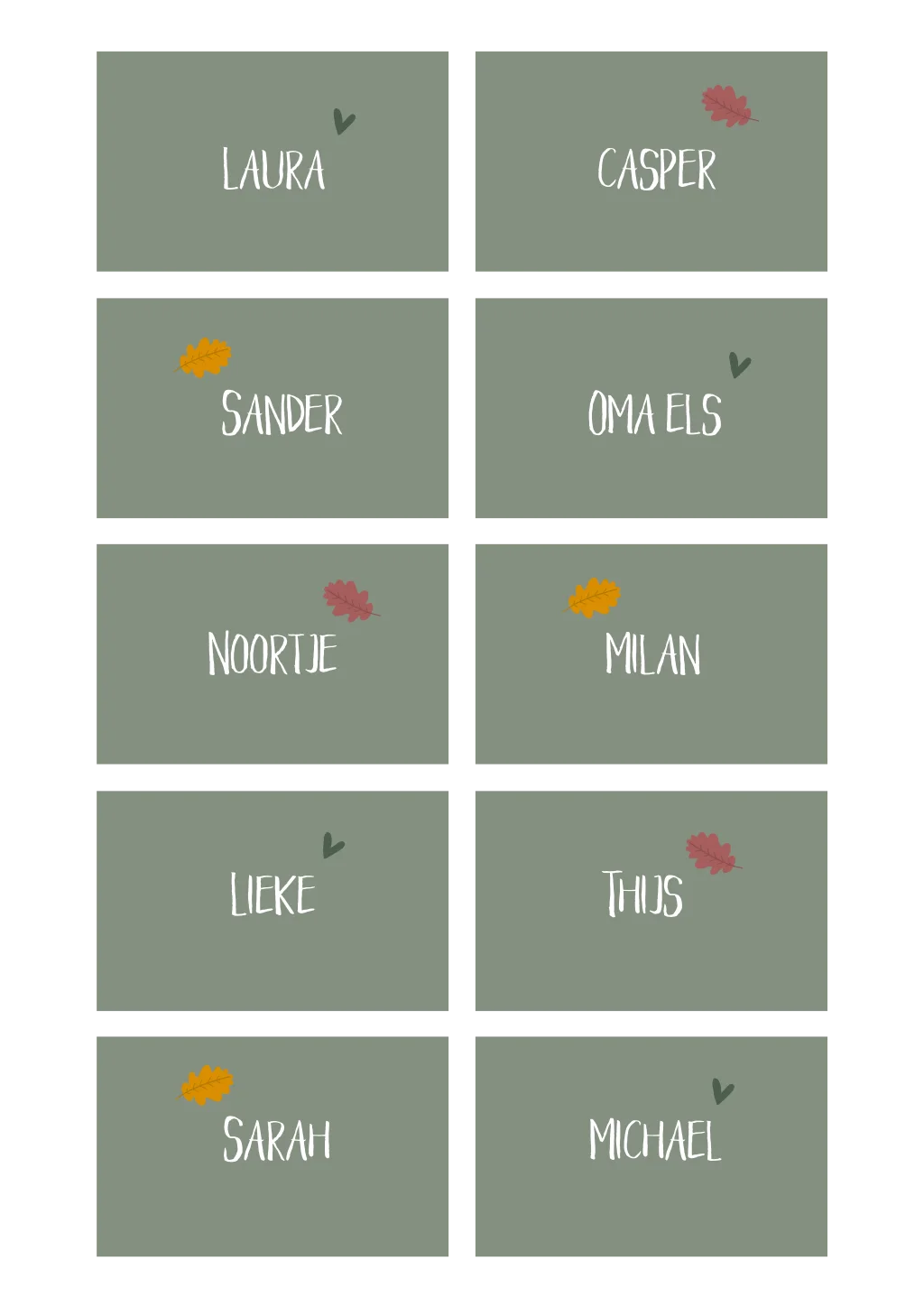Deze lieve minimalistische naamkaartjes, passend bij een herfst trouwkaart, kun je volledig aanpassen zodat hij bij jullie herfstige trouwtafelsetting past. De kaartjes zijn 8 x 5 cm groot.