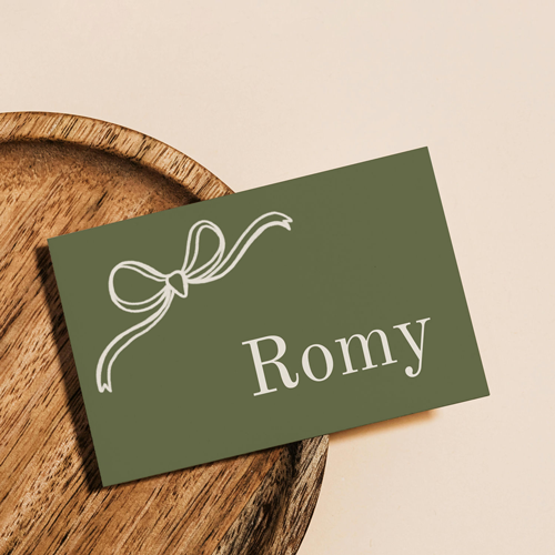 Lieve naamkaartjes met strik voor jullie bruiloft in de stijl van de bijpassende trouwkaart. Deze naamkaartjes zijn enkelzijdig. Formaat: 8x5cm.