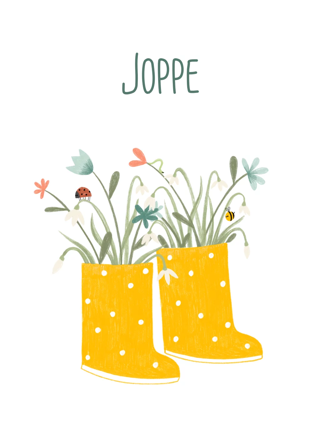 Leuke geboorteposter met laarsjes en lente bloemen. Afmeting: 40x30 cm