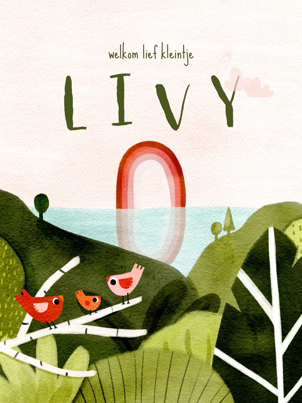 Een kleurrijke geboorteposter met een illustratie van een landschap vol groene bomen, uitkijkend op de zee en met een mooie roze regenboog. Vooraan op de tak zit een lief klein vogel gezin. Deze poster past mooi bij het geboortekaartje, prachtig voor jongens en meisjes.