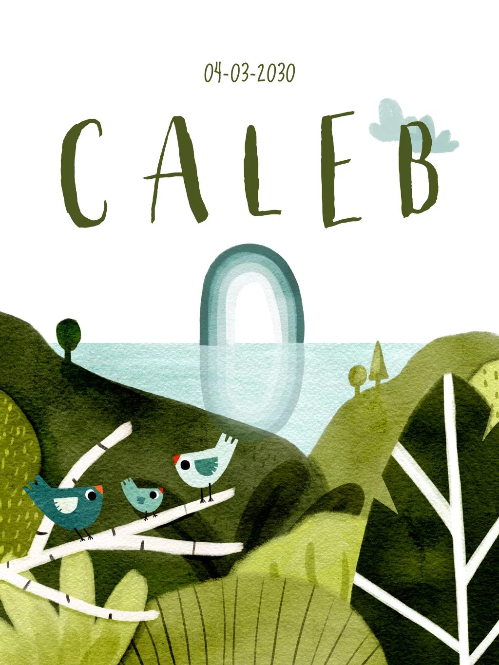 Een kleurrijke geboorteposter met een illustratie van een landschap vol groene bomen, uitkijkend op de zee en met een mooie blauwe regenboog. Vooraan op de tak zit een lief klein vogel gezin. Deze poster past mooi bij het geboortekaartje, prachtig voor jongens en meisjes.