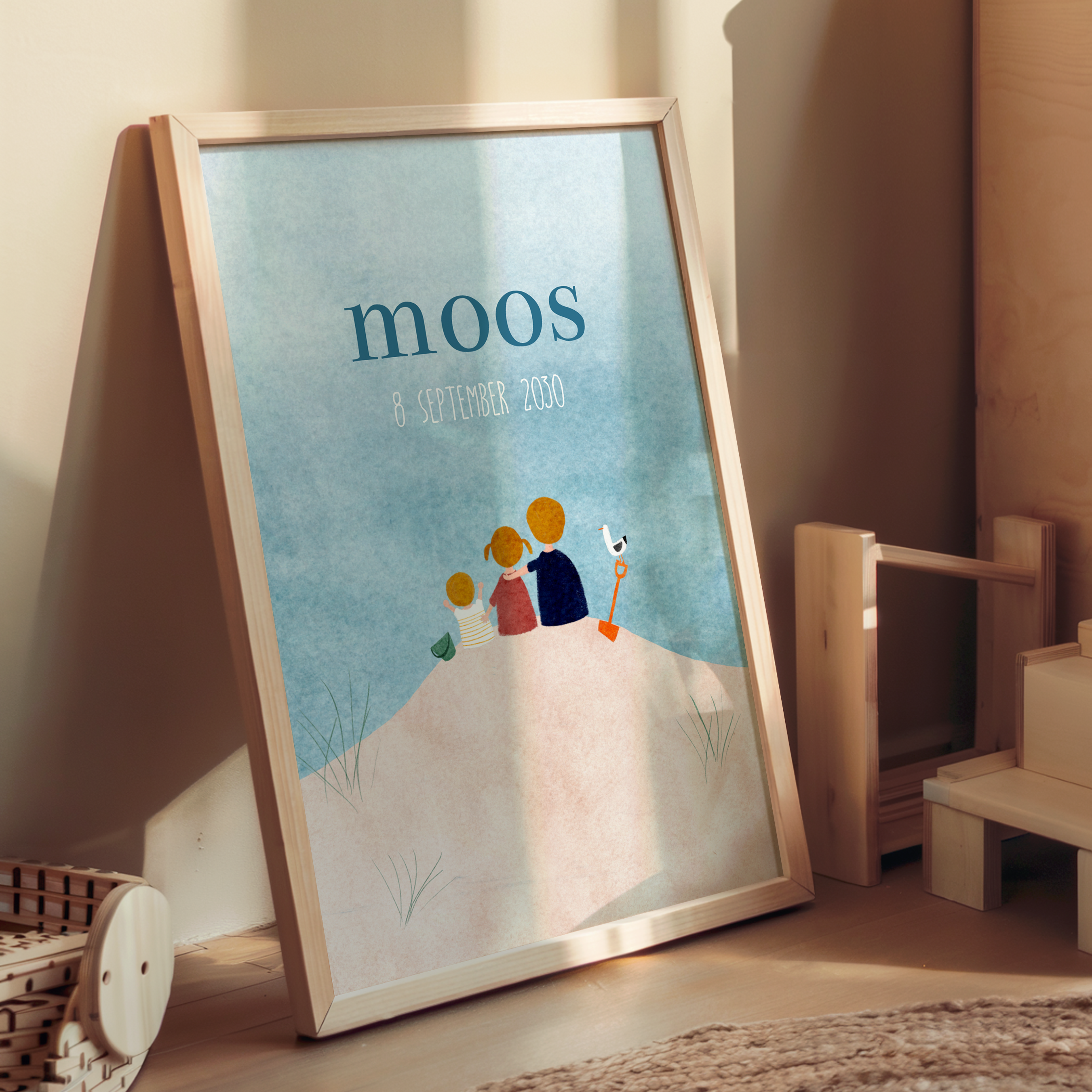Leuke geboorteposter van een zomers strand met een kindje en de grote broer en zus. Past perfect bij het geboortekaartje.