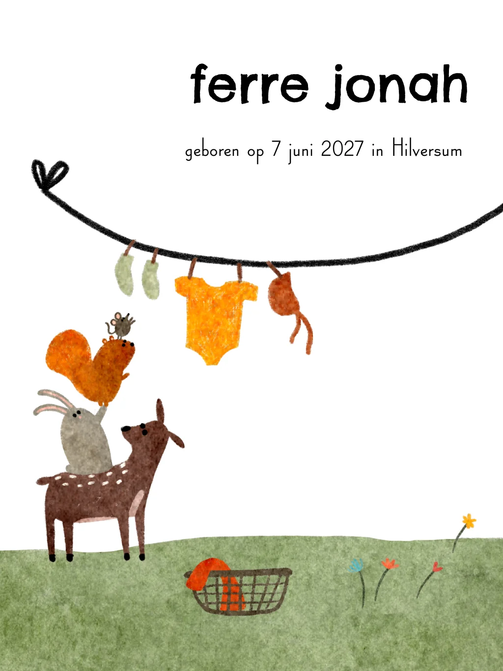 Een lieve en vrolijke geboorteposter met een waslijntje met babykleertjes en de naam van je kindje. Deze poster past mooi bij het geboortekaartje.