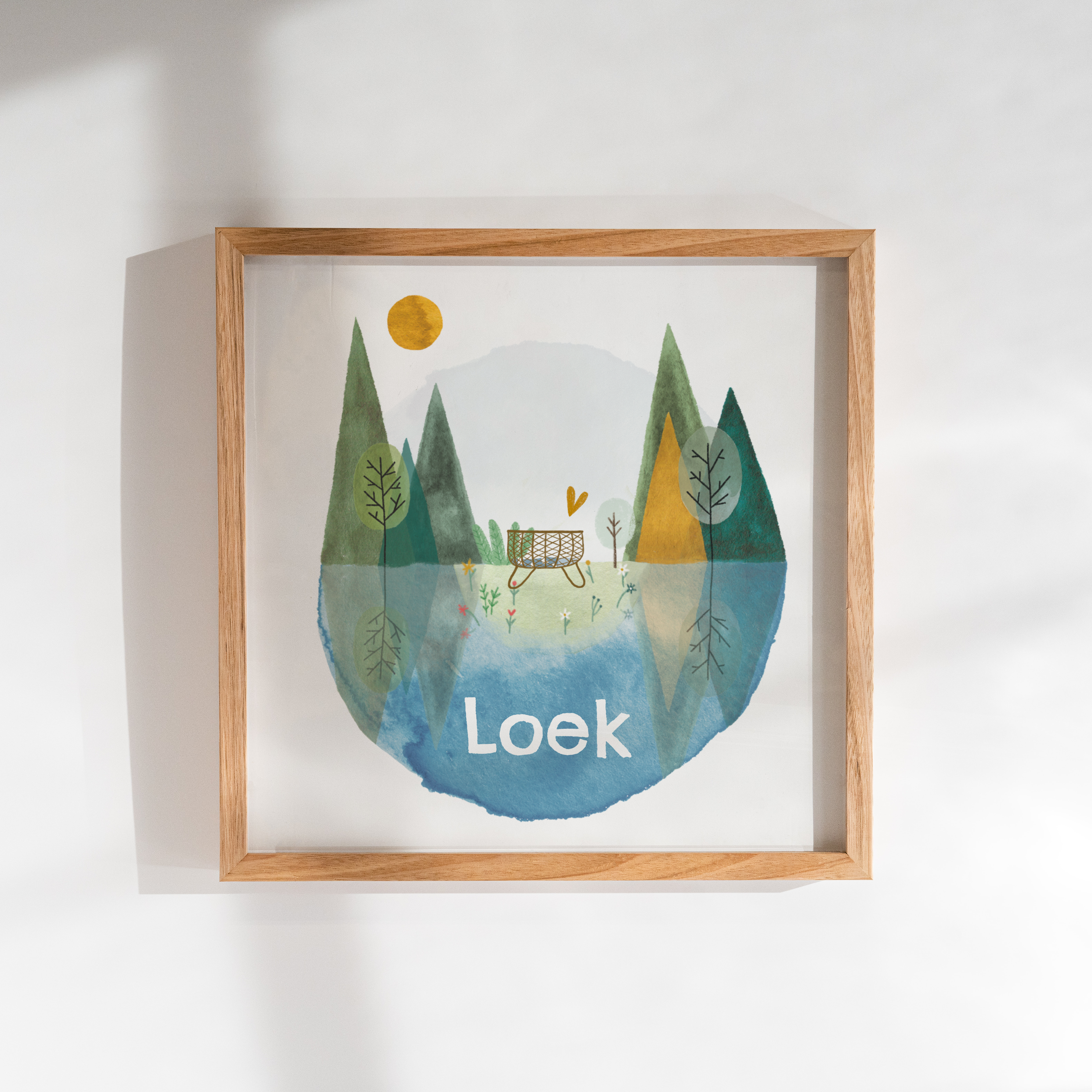 Leuke geboorteposter (40x40 cm) met een illustratie van een wiegje in de natuur. Past mooi bij het geboortekaartje.