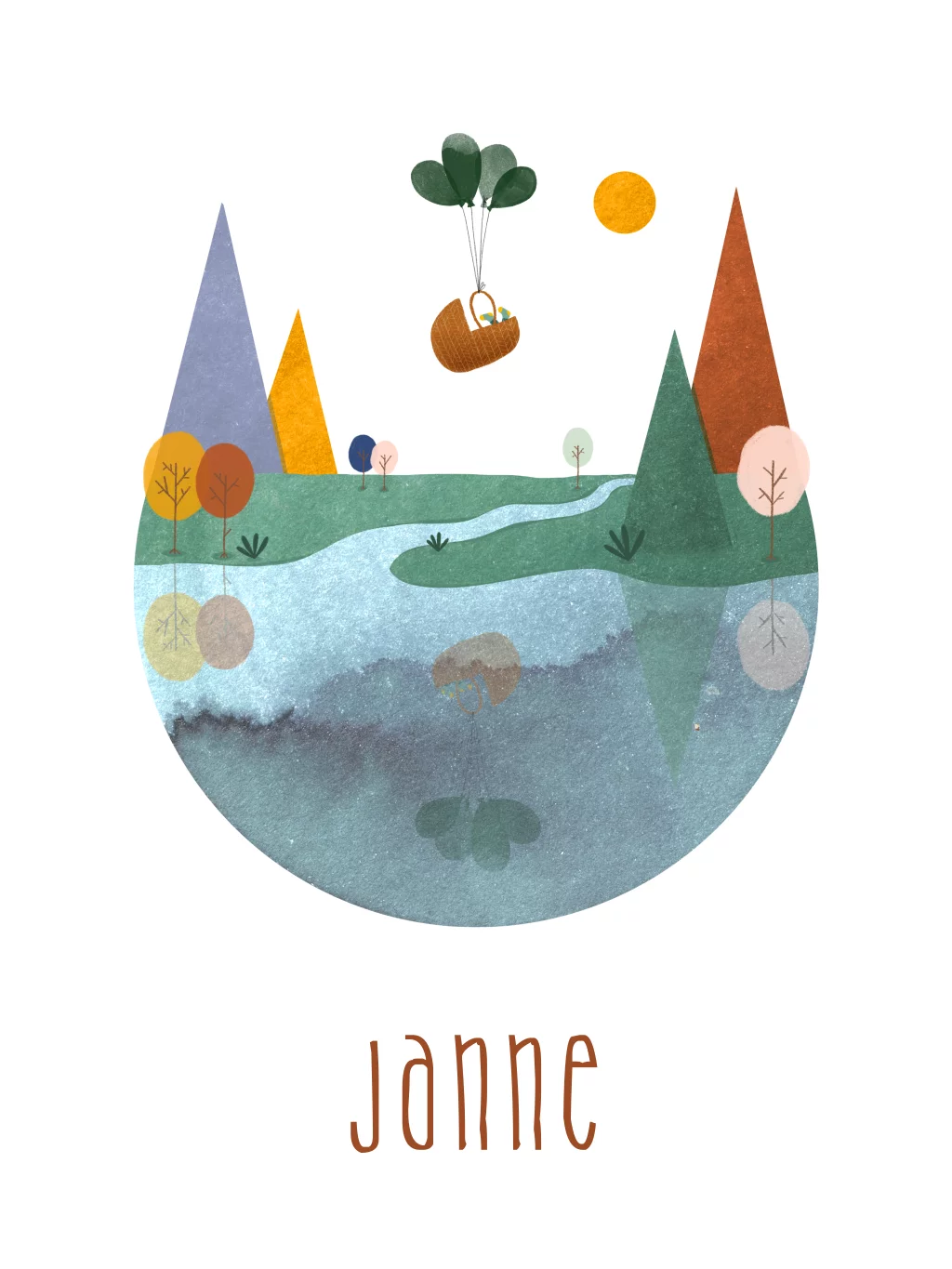 Een kleurrijke geboorteposter met een landschap en vliegend wiegje aan een tros ballonnetjes. Afmeting: 40 x 30 cm