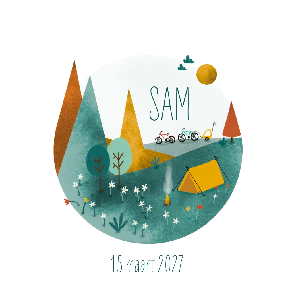 Een lieve geboorteposter met waterverf illustratie van een landschap met tentje en fietsjes.