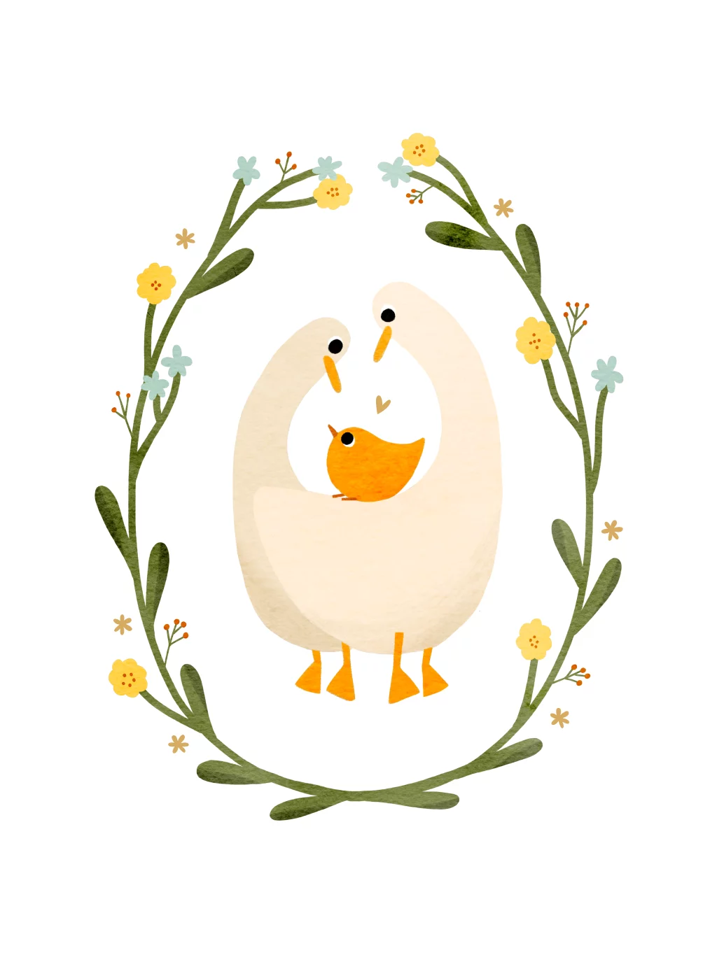 Een lieve poster van een gezin van gansjes met vrolijke bloemenkrans eromheen. Deze kun je ook verwijderen.