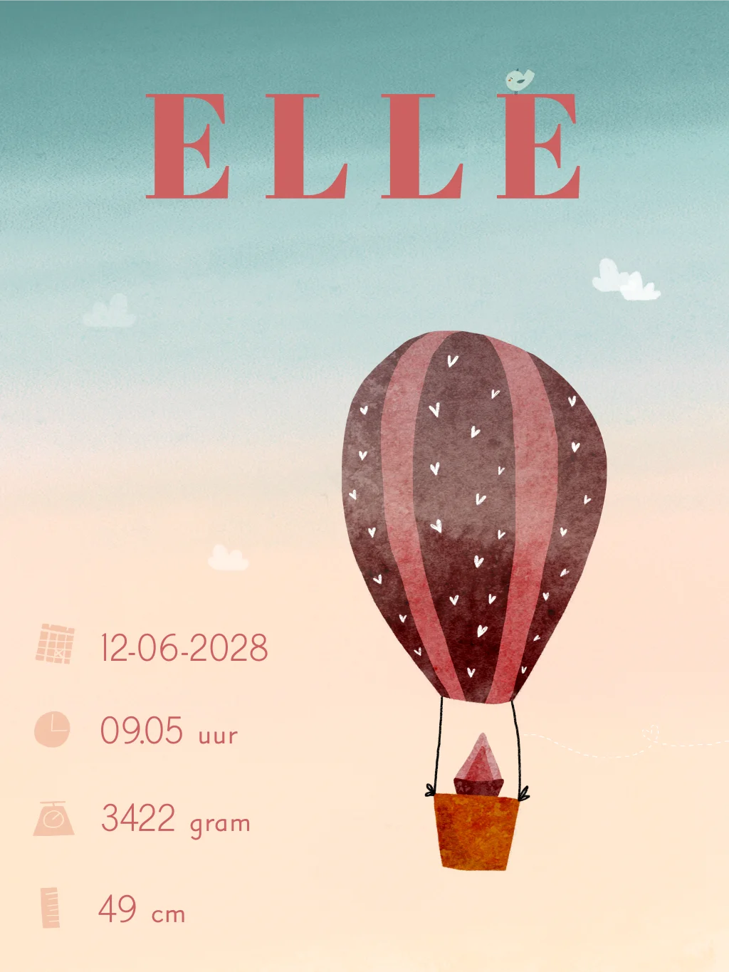 Leuke staande geboorteposter met waterverf illustratie van een luchtballon met een wiegje erin. Op de achtergrond een prachtige waterverf achtergrond van een lucht vol kleuren van de zonsondergang.