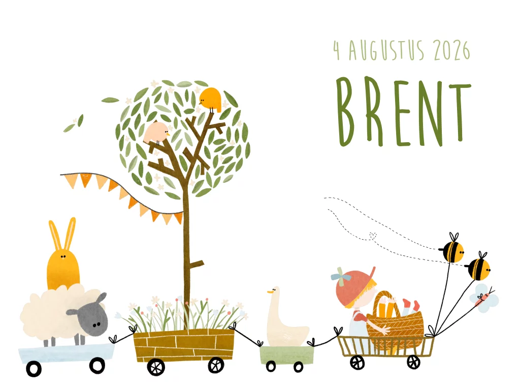 Leuke geboorteposter (30x40 cm) met een treintje met verschillende lente diertjes, zoals een schaap, konijn en gans, in zachte vrolijke kleuren. Een grote broer houdt een mandje met baby vast. Pas zelf de haarkleur van het jongetje aan door erop te klikken. Past mooi bij het geboortekaartje.