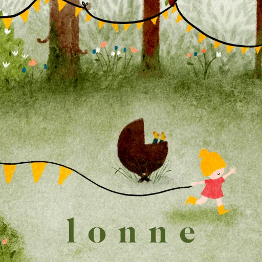 Wauw, hoe mooi is deze geboortetegel met zomers tafereel van een vrolijk bos vol blaadjes en bloemen, gezellige slingers, en een wiegje met lieve voetjes. Grote zus hangt de slingers op.
