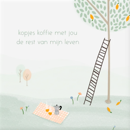 Een tegeltje met illustratie van koffiedrinken op een lief picknick kleedje en een citroenboom in een vrolijk landschap. Leuk om te geven als trouw cadeau en om te krijgen. Of geef jezelf een blijvende herinnering aan de trouwdag en trouwkaart.