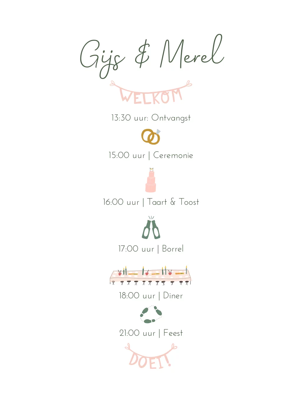 Een handige dagplanning voor jullie bruiloft om aan de gasten te laten zien hoe de dag eruit gaat zien.