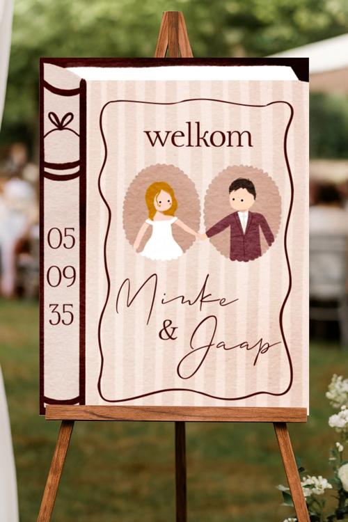 Een lief geillustreerd welkomsbord met een illustratie van de voorkant van een boek, met een portret van het bruidspaar en lieve hippe rococo details.