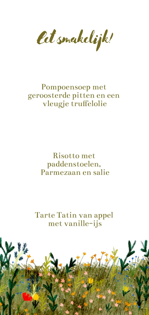 Deze menukaart met een veld bloemen en klaprozen past prachtig bij de trouwkaart uit dezelfde collectie.