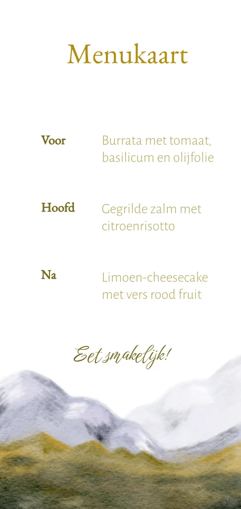 Romantische menukaart passend bij de save the date en trouwkaart uit dezelfde serie. De zachte aquarelkleuren en luxe uitstraling maken dit ontwerp perfect voor stellen die een natuurlijke en stijlvolle trouwkaart zoeken.