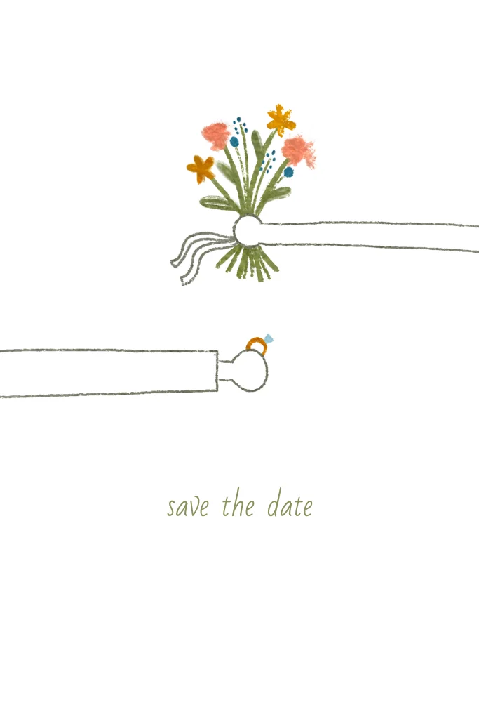 Een stijlvolle minimalistische save the date kaart met een subtiele handgetekende illustratie van twee armen, één waarbij het handje boeket vasthoudt, de ander met een ring. De zachte kleuren en speelse details maken dit ontwerp lief en persoonlijk.
