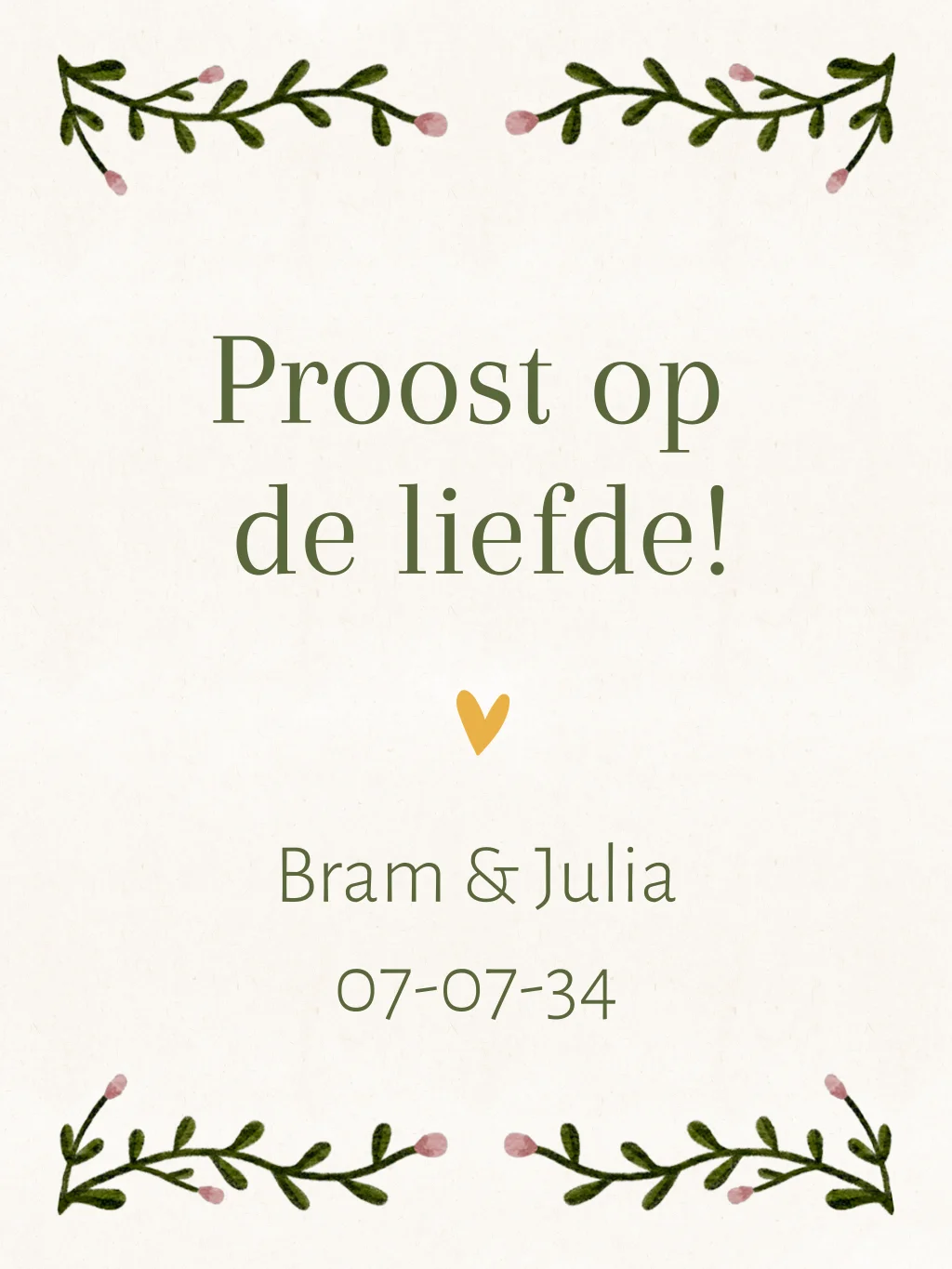 Wijnetiket voor op een fles als bedankje aan de gasten van jullie bruiloft. Formaat: liggend 90 x 120 mm. Pas dit etiket helemaal naar wens aan en maak hem passend bij jullie trouwhuisstijl. Je krijgt 4 stickers op 1 vel.