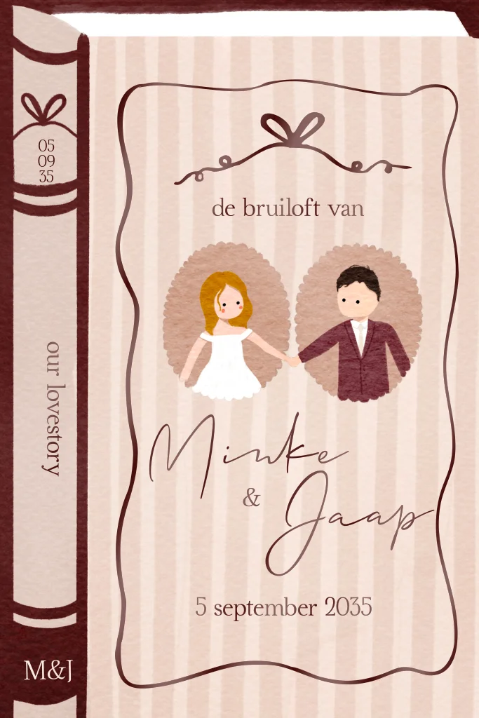 Deze unieke trouwkaart heeft een originele illustratie van de voorkant van een boek, met hippe rococo elementen. Er staat ook een lief portret van bruid en bruidegom op de voorkant. Op de rug van het ‘boek’ staat jullie trouwdatum en initialen, waardoor het lijkt alsof jullie eigen liefdesverhaal in de boekenkast staat. Pas de kaart zelf naar wens aan. Een andere kleurstelling of wijziging in portret? Mail even!