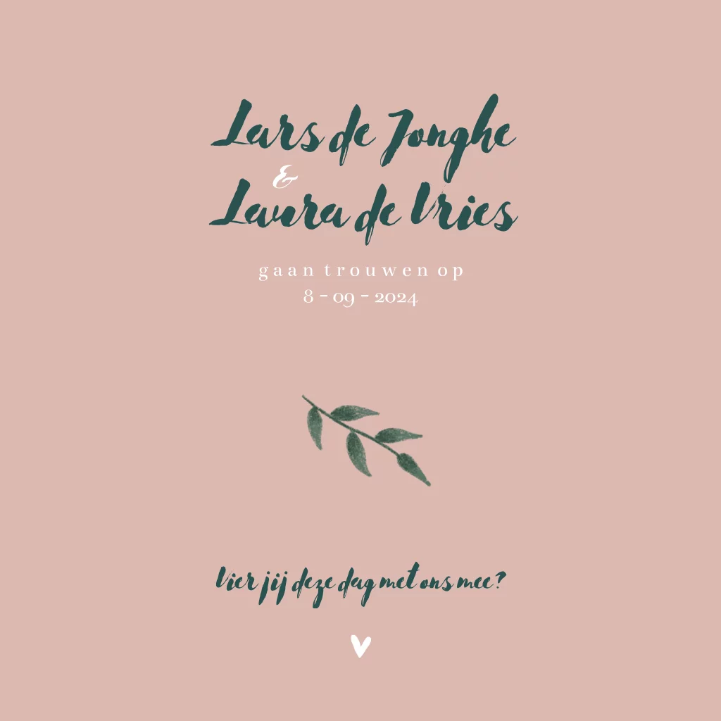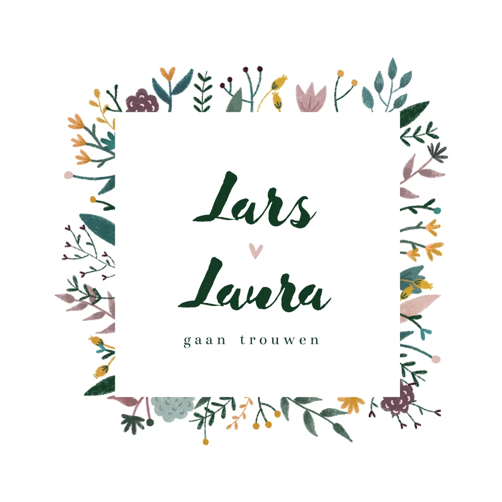 Een trouwkaart met bloemen en plantjes in warme kleuren. Ga zelf aan de slag met de icoontjes!