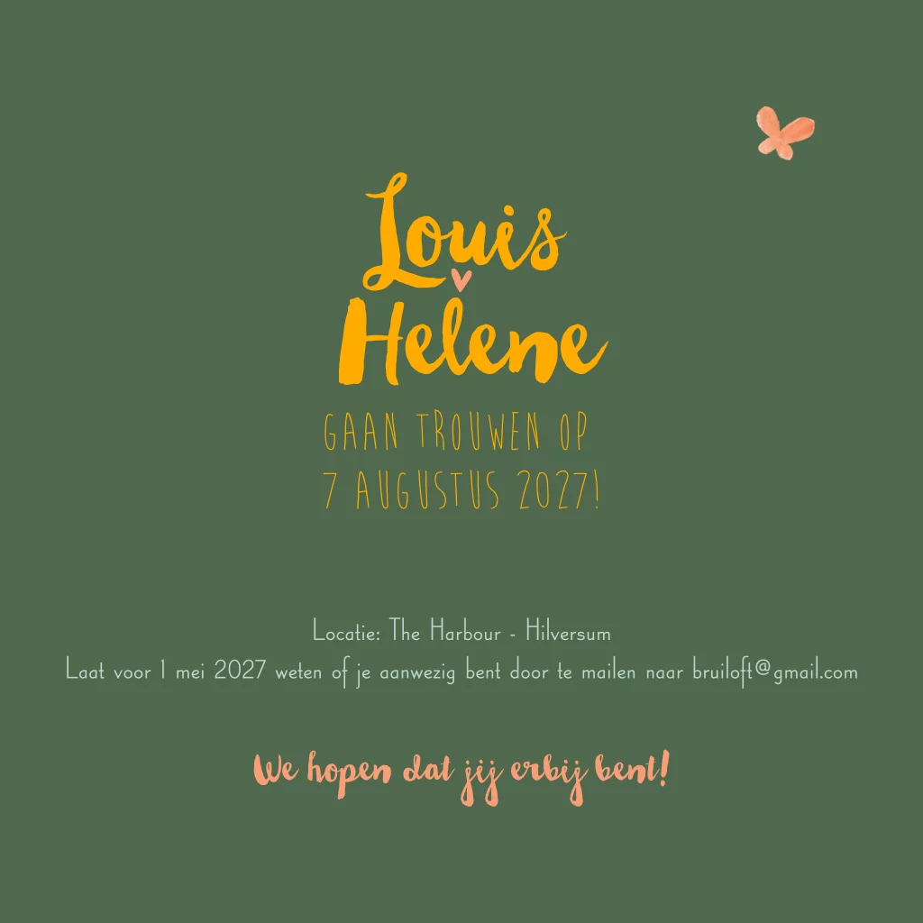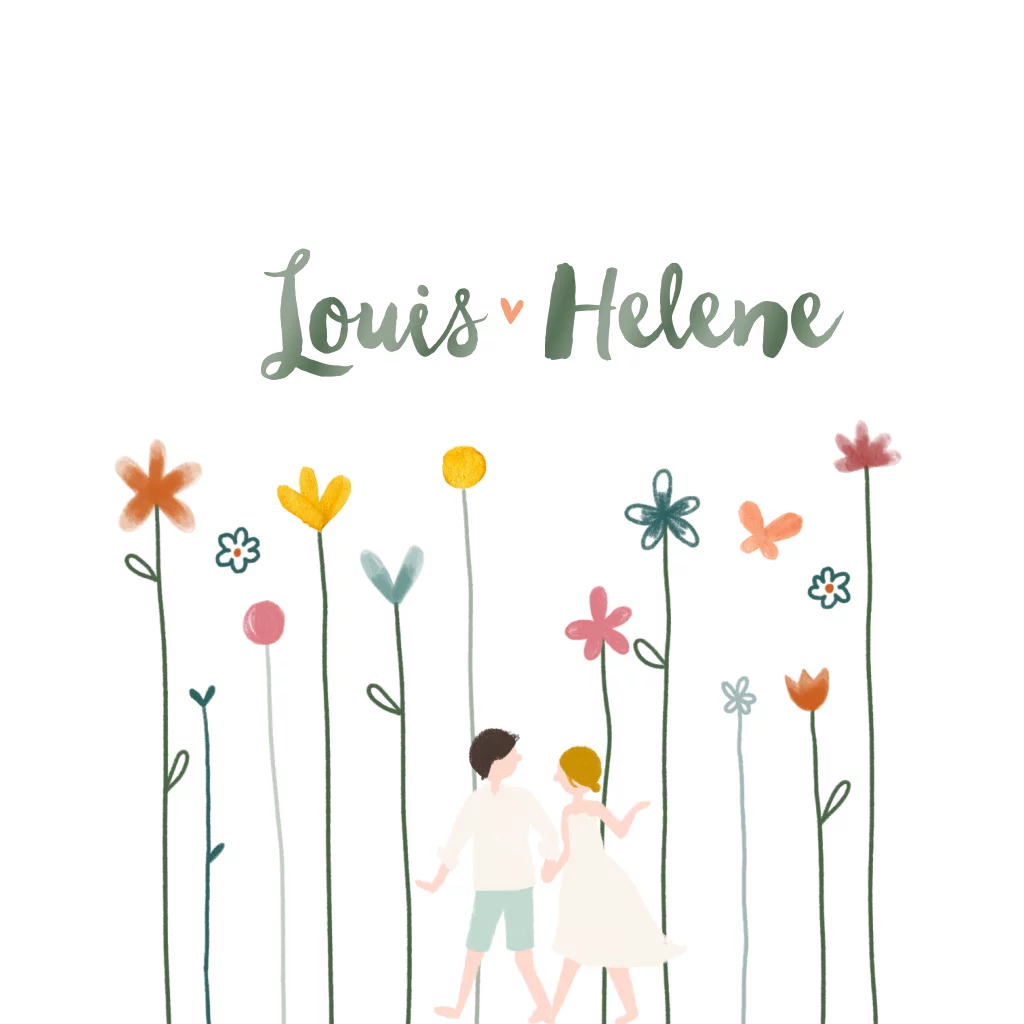 Een zomerse lieve unieke romantische trouwkaart met een illustratie van een bruidspaartje wat door een bos van bloemen wandelt. Pas zelf alle kleuren van het bruidspaartje naar wens aan. Wil je het geslacht/kapsel aanpassen? Stuur een berichtje en ik pas het kosteloos voor je aan!