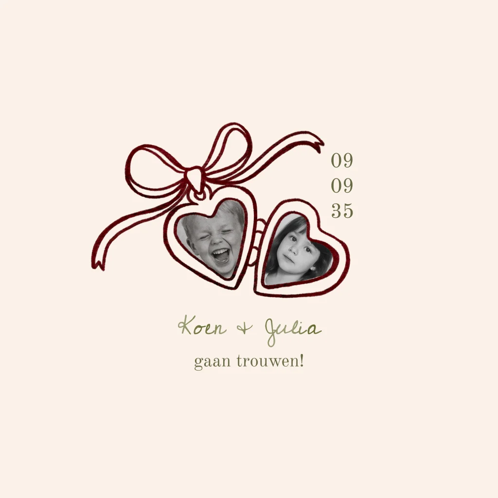 Deze unieke trouwkaart met kinderfoto’s van het bruidspaar in een getekend hartmedaillon is een lieve knipoog naar vroeger. De handgetekende illustratie met lint, gecombineerd met de zachte crème achtergrond en warme tinten bordeaux en olijfgroen, zorgt voor een stijlvolle vintage look met een moderne twist.