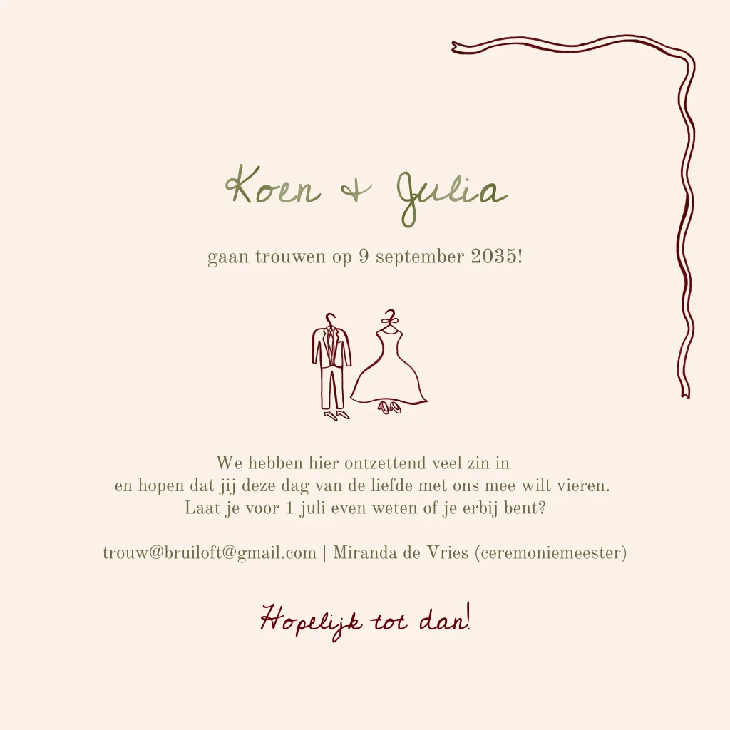 Laat jullie gasten alvast glimlachen bij het zien van deze bijzondere kaart, een ontwerp dat perfect past bij koppels die houden van persoonlijke trouwkaarten, nostalgische details en tijdloze eenvoud. Bewerk de kaart helemaal naar wens. Andere achtergrond kleur? Mail even!