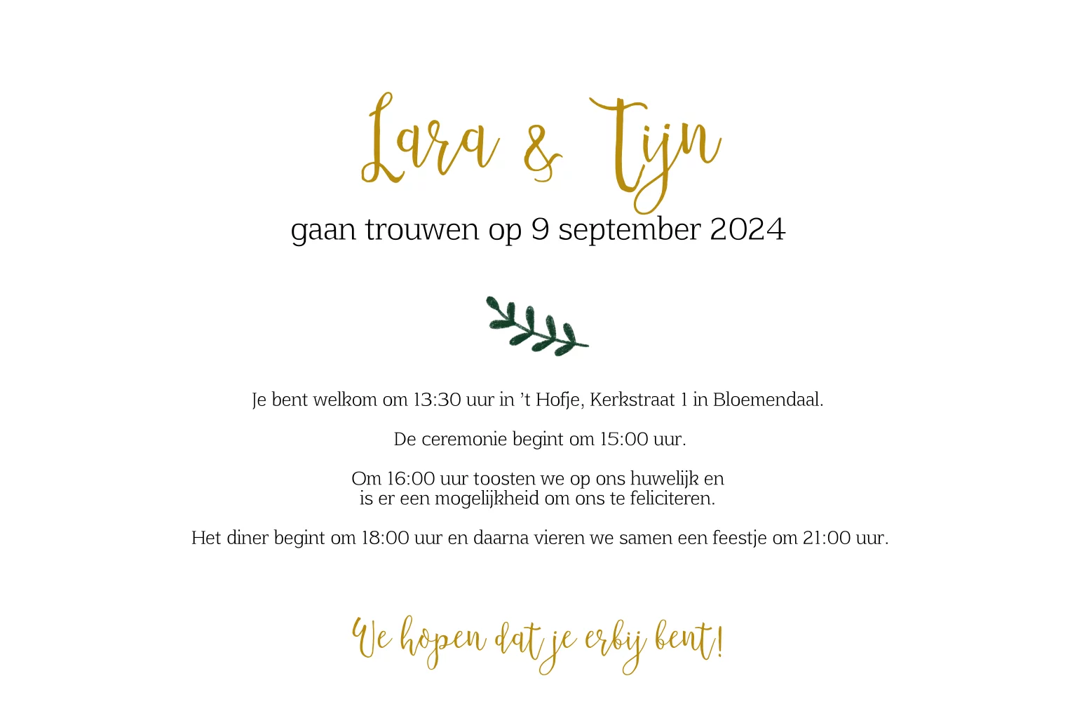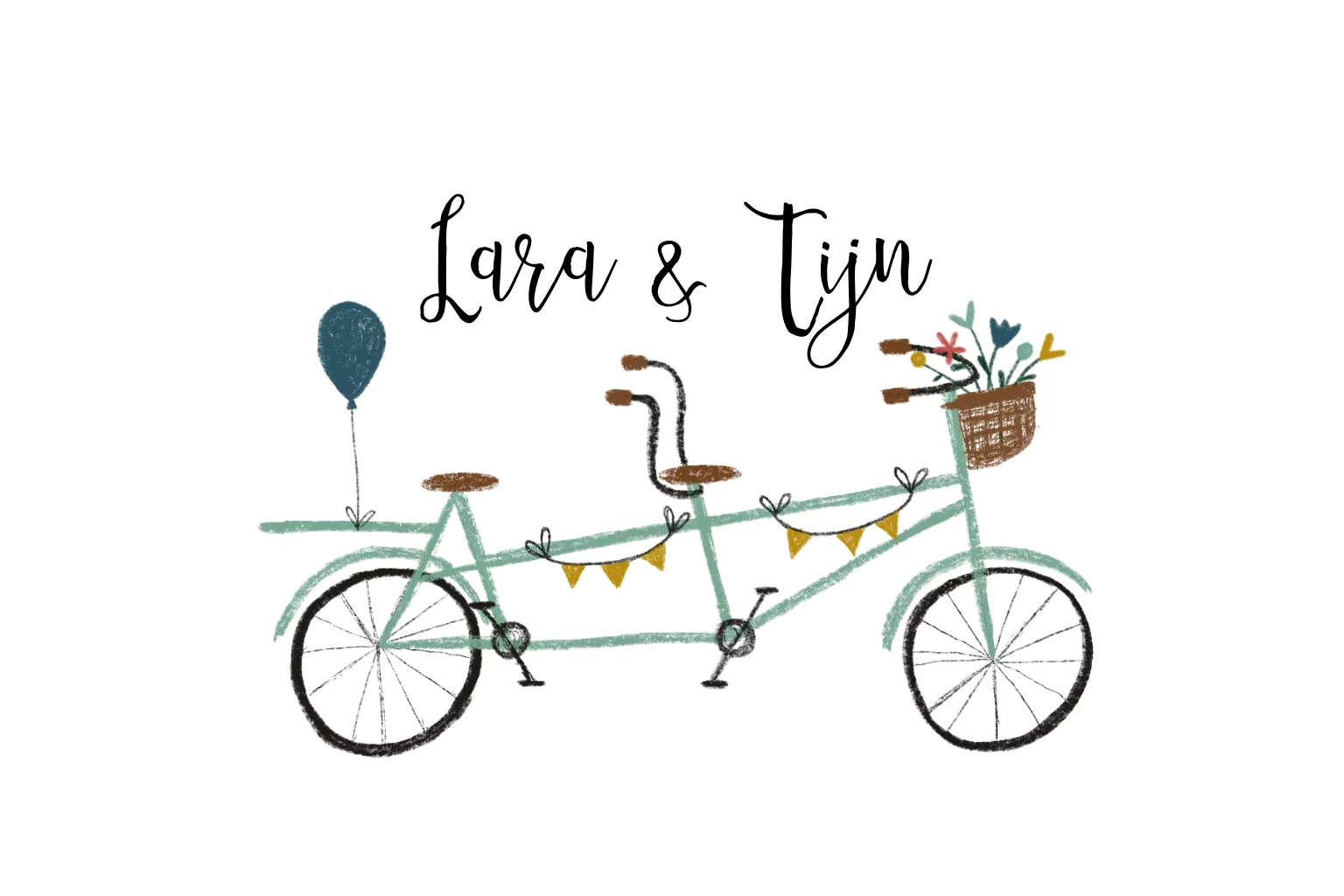 Een vrolijke trouwkaart met een gezellige tandemfiets met slingertjes. De binnenkant en lettertype is naar wens aan te passen.