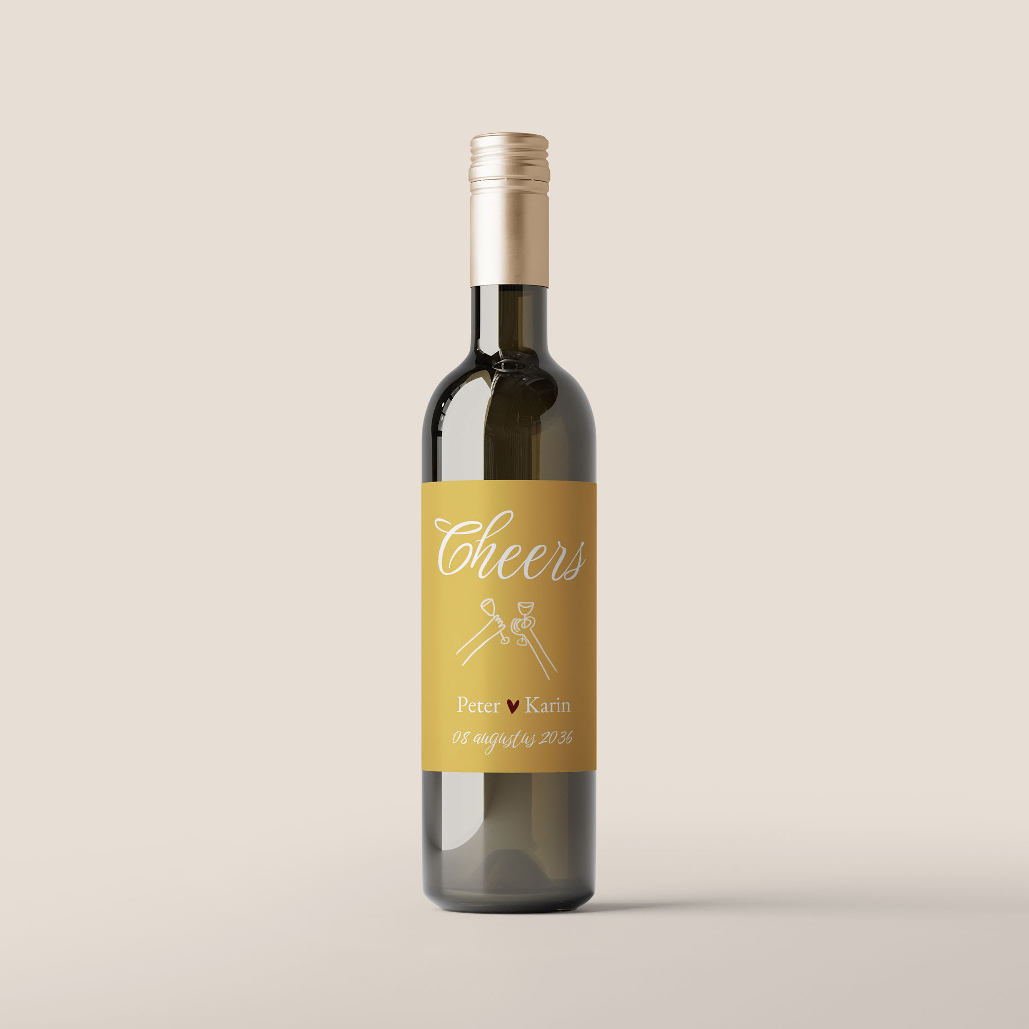 Wijnetiket voor op een fles als bedankje aan de gasten van jullie bruiloft. Formaat: staand 80 x 110 mm. Pas dit etiket helemaal naar wens aan en maak hem passend bij jullie trouwhuisstijl. Je krijgt 5 stickers op 1 vel.