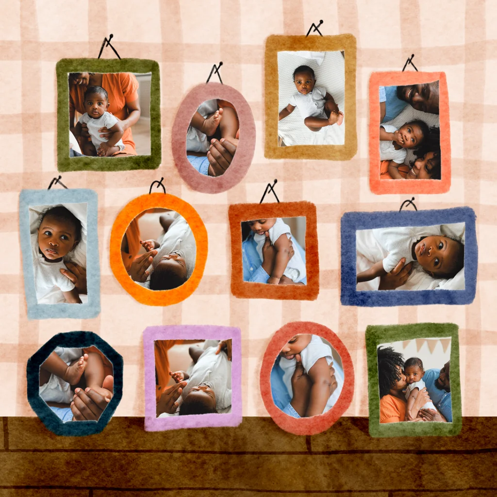 Een schattige uitnodiging voor een eerste verjaardag met 12 foto's in leuke fotolijstjes.
