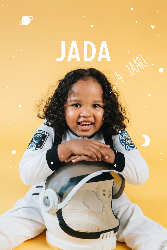 Een stoere uitnodiging met goudfolie planeten details. Leuk voor kindjes die van ruimte en astronauten houden!