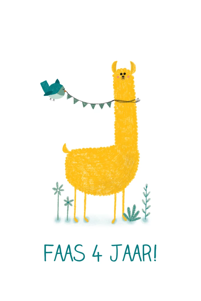 Een vrolijke uitnodiging voor een kinderfeestje met illustratie van een lama en een vogeltje met een slinger. Pas het kaartje aan naar wens.