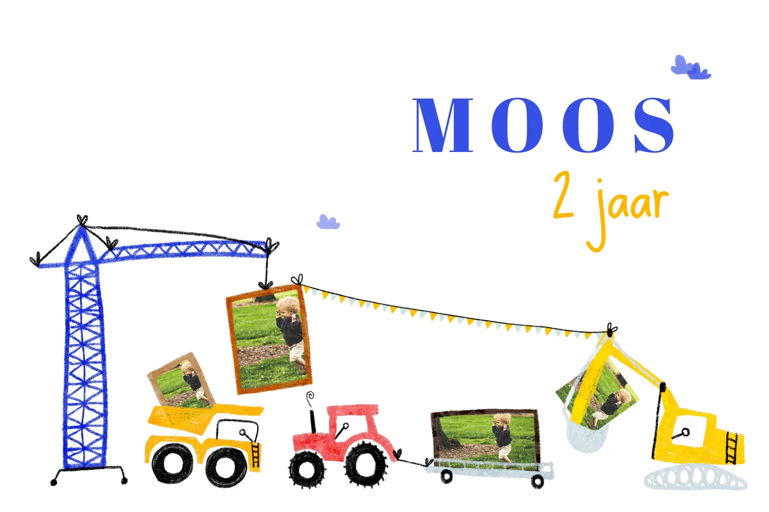 Een schattige stoere verjaardagsuitnodiging met illustraties van voertuigen, waarbij je ook foto's kunt toevoegen om het kaartje super persoonlijk te maken.