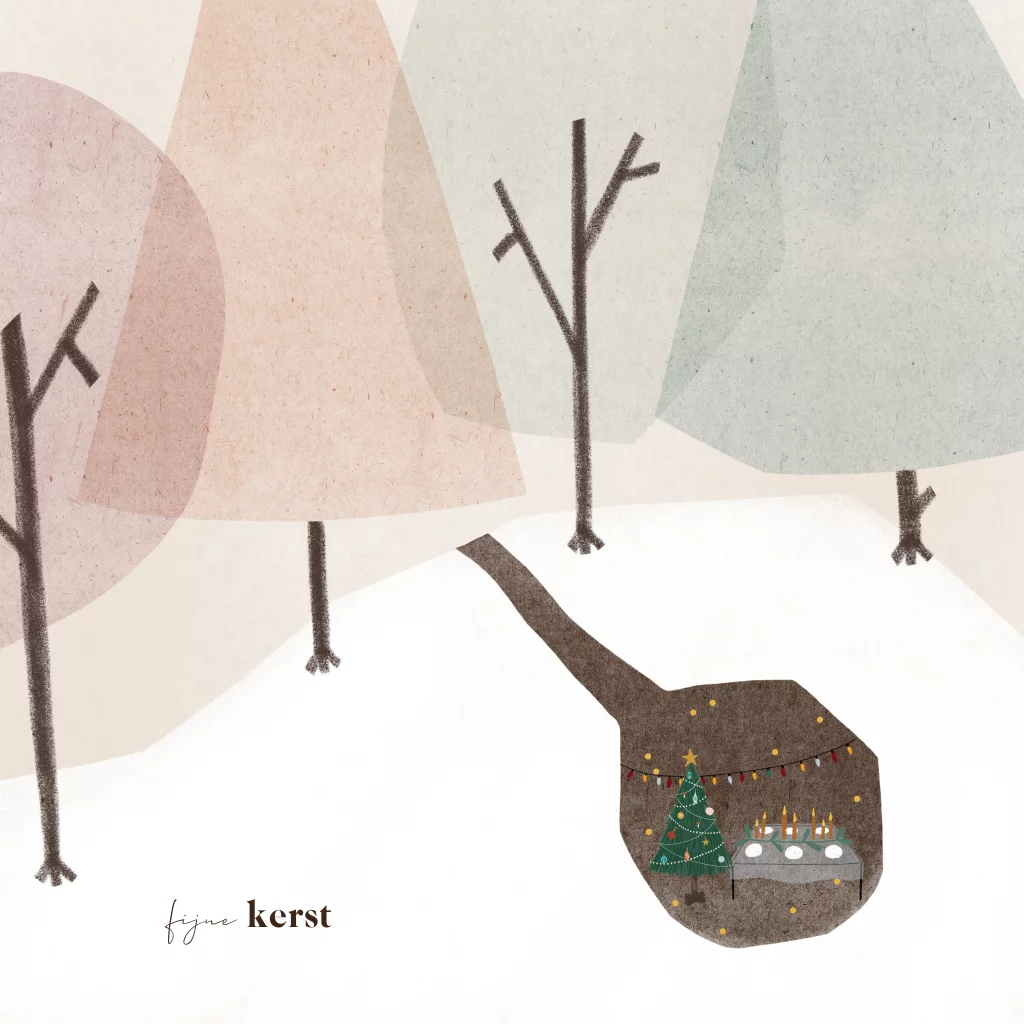 Een schattige kerstkaart met een minimalistische illustratie van een winterbos met een ondergronds holletje met allerlei gezellige elementjes zoals een kerstboom en tafel, klaar voor het kerstdiner. Pas het kaartje volledig naar wens aan!