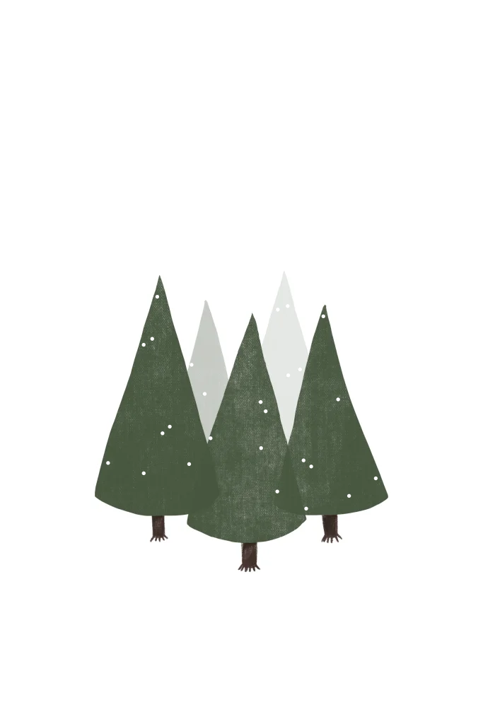 Een minimalistische kerstkaart met een illustratie van dennenbomen met zilverfolie sneeuw vlokjes.