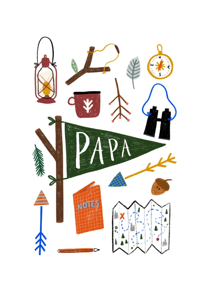 Een vaderdag wenskaart voor avontuurlijke vaders! Met illustraties van spoorzoeken en avonturen.