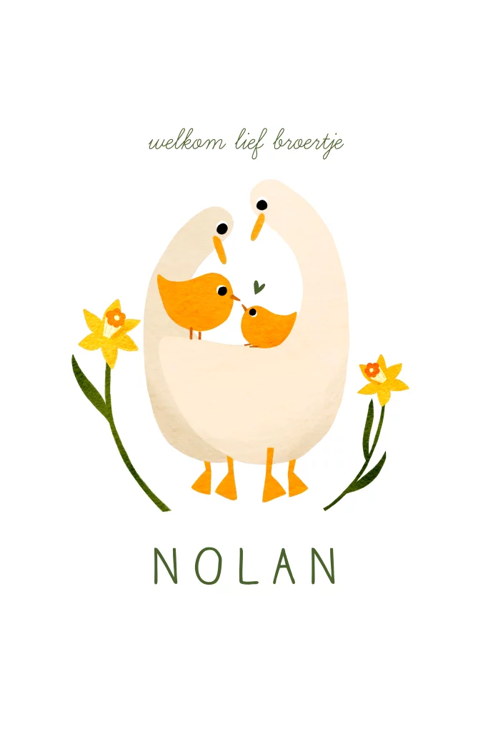 Een lieve minimalistische wenskaart met een gezin van gansjes. Leuk om te versturen als er een tweede kindje is geboren. Personaliseer de kaart door de naam in te voeren.