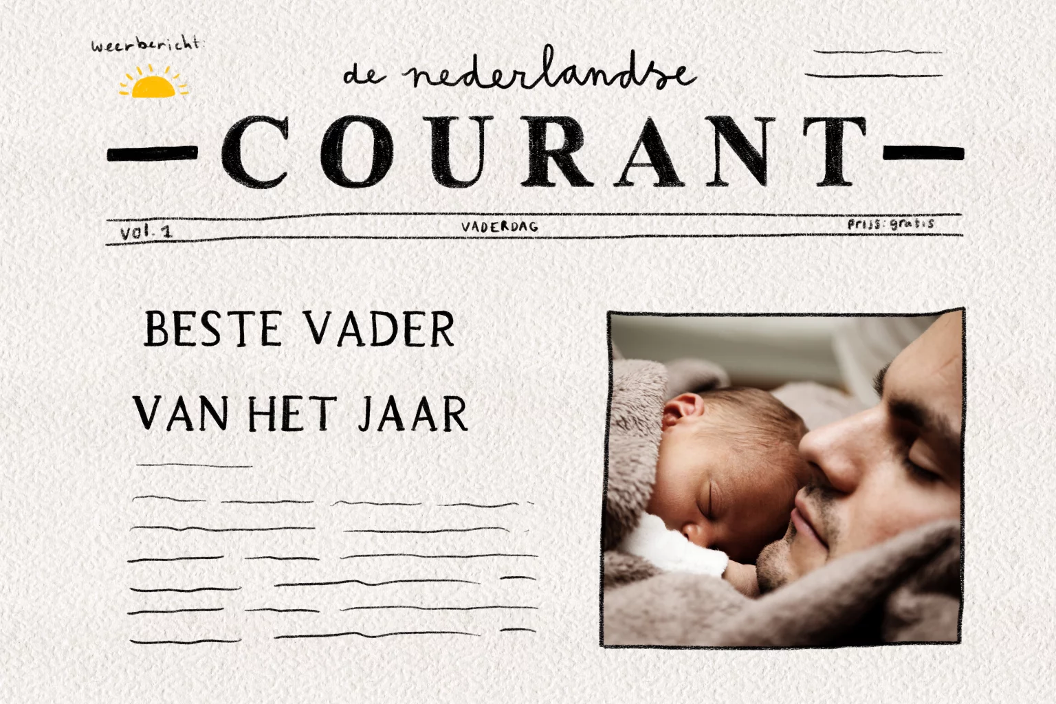 Een wenskaart voor de eerste vaderdag met illustratie van een krant voorpagina, waarbij je de foto zelf kunt aanpassen.