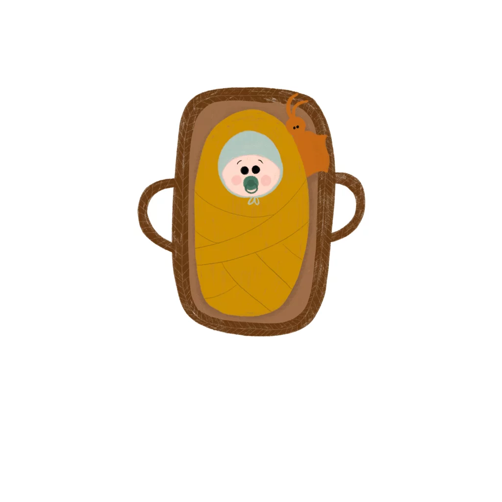 Een wenskaart met een lief mozesmandje met een kindje erin. Andere huidskleur? Kijk even in de editor onder 'Wiegje'.